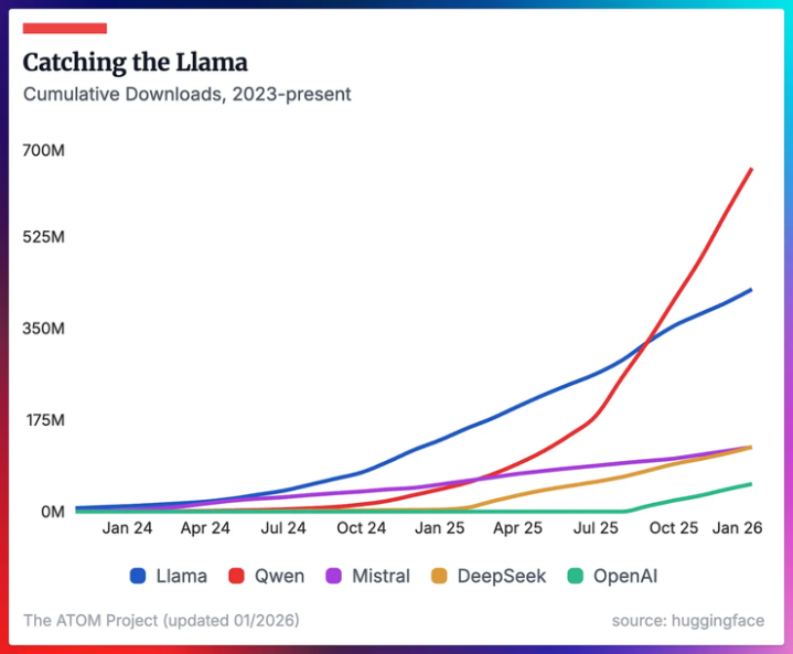 图说:全球五大主流开源模型厂商累计下载量(2023年至今)