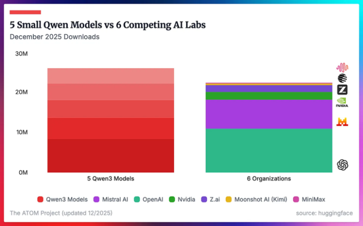 美国AI专家内森·兰伯特通过对数据的深入分析指出,千问系列的爆发式增长,很大程度上得益于千问3系列在轻量级模型上的前瞻性布局。仅凭5款小尺寸模型,其在2025年12月的单月下载量便已超越Mistral、OpenAI、英伟达等6家国际领先AI厂商旗下所有开源模型当月下载量的总和,展现出了强劲的“聚集效应”,进一步印证了阿里千问开源模型群的整体生态优势。