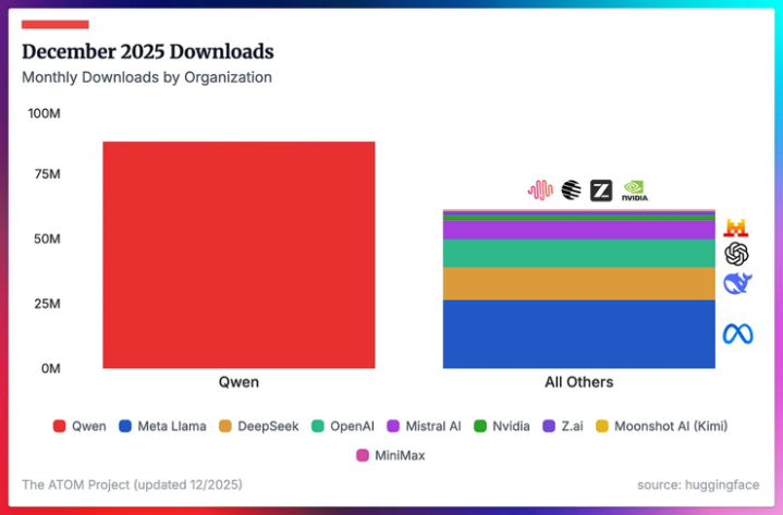 图说:2025年12月达道宝,各大主流开源模型厂商单月下载量